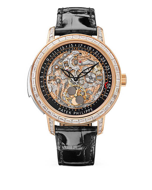 直徑42mm 18K玫瑰金與白金錶殼,錶圈、錶耳與錶扣鑲嵌80顆方形鑽石,約6.22克拉/時間指示、三問報時、逆跳日期、星期、月份、閏年、月相盈虧與萬年曆功能/R 27 PS QR LU自動上鍊機芯/藍寶石水晶鏡面、透明底蓋/無防水/參考價請電洽