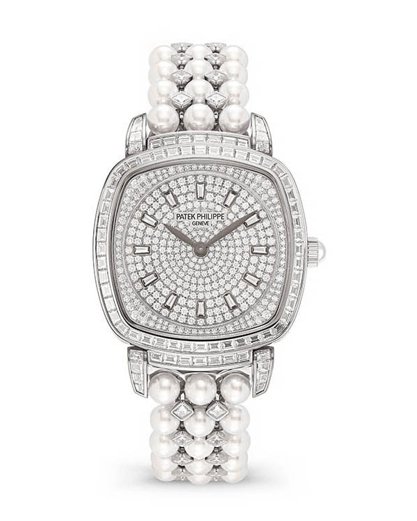 直徑31x34.8mm 18K白金錶殼,錶款、面盤與鍊帶共鑲嵌552顆鑽石,約6.04克拉/時間指示/215手動上鍊機芯/藍寶石水晶鏡面、透明底蓋/鍊帶鑲嵌78顆Akoya珍珠,約48.85克拉/防水30米/參考價請電洽